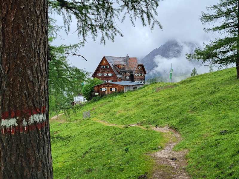 Am wunderschönen Fünf-Hütten-Weg sind wir auch zur Austriahütte gekommen und haben dort eine kurze Rast gemacht. Nach ein paar Minuten auf der Terrasse war uns doch der Wind zu kalt und wir sind ins Innere in eine der gemütlichen Stuben mit Blick auf die Dachstein-Südwand übersiedelt. Es war kein Problem, dass die bereits draußen aufgegebene Bestellung „umgeleitet“ wurde und unsere Getränke innen serviert wurden. Die Getränke – Tee und Kaffee – waren gut, das Service sehr freundlich. Bei einem früheren Aufenthalt haben wir hier auch gegessen – alle Speisen damals waren sehr gut (und reichlich). Damals haben wir auch das in der Austriahütte befindliche und absolut sehenswerte Alpinmuseum besichtigt. Die Austriahütte war den neuerlichen kurzen Besuch jedenfalls wert.
