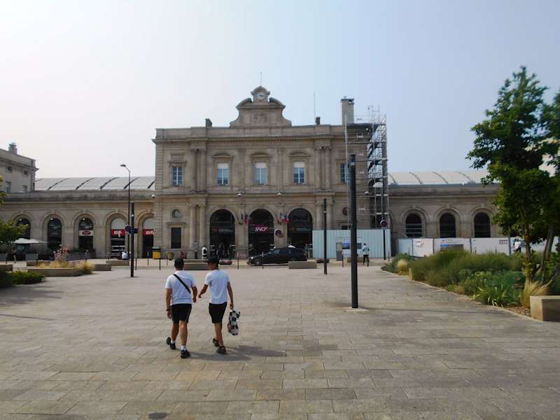 Der Bahnhof am Rande der Altstadt öffnet sich nach Süden zu der begrünten Promenade, die parkähnlich den Verlauf der alten Stadtmauer markiert. Am nördlichen Ende der Promenade steht die Porte de Mars, ein aus römischer Zeit stammenden Triumphbogen, der auch als Stadttor diente. Das Bahnhofsgebäude aus dem 19. Jahrhundert wurde während der Kriege 1870 und 1917 stark beschädigt und in den Jahren 1932–1935 wiederaufgebaut. Im Inneren wurde der Bahnhof modernisiert und bietet einen guten Service.