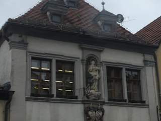 In der Marktstr. 18 von Arnstein (Unterfranken) befindet sich das sogenannte Balleshaus. Dieses historische Haus - mit seinem schönen Eingangsportal, dem ehemaligen Familienwappen, sowie einer auffälligen, großen Marienfigur (Darstellung als Maria Immaculata / Maria der unbefleckten Empfängins) zwischen den Fenstern im 1. Stock - steht gegenüber vom Rathaus und wurde 1725 erbaut. Bauherr war der Tuchhändler Georg Roth. Zuletzt wohnte hier die Familie Balles (woher auch der heute benutzte Name für dieses Haus stammt). Von der Familie Balles kauft die Stadt Arnstein im Jahr 1987 das schöne Gebäude ab. Heute ist im Balleshaus die Stadtbibliothek und das Stadtarchiv von Arnstein untergebracht. Wenn man in der Altstadt von Arnstein unterwegs ist, so sollte man sich durchaus auch einmal dieses beeindruckende Bauwerk ansehen. Man kann es in der Marktstraße kaum übersehen, steht es doch gegenüber vom Rathaus und sticht einem ins Auge.