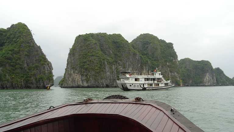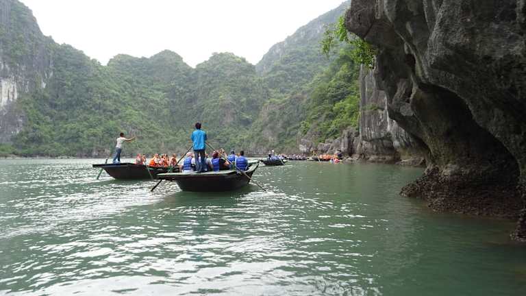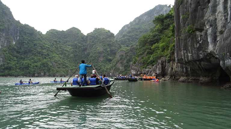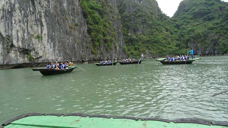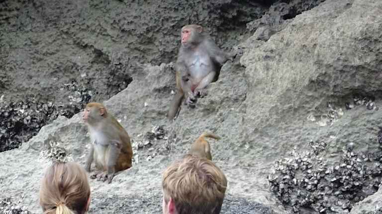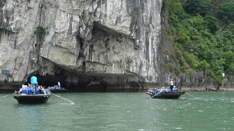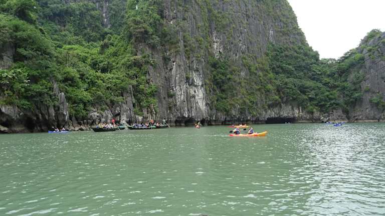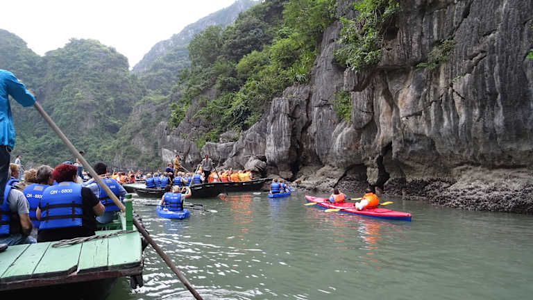 Wenn man mit einem Kreuzfahrtschiff eine Cruise durch die Halong Bay macht, sollte man sich diesen Abstecher nicht entgehen lassen. Mit dem Beiboot wird man zu einer schwimmenden Plattform gebracht, wo man dan in das Bamboo Boot, es ist ein großes Ruderboot für 10 Personen geeignet umsteigt. Man muß nicht selbst rudern, ein Angestellter rudert den Kahn durch eine Art Felsentunnel in einen Krater. Dort sitzen die Affen und warten auf die Leute und werden gefüttert. Danach geht es noch durch den Krater und dann zurück zur Plattform. Wer lieber selbst fahren mag, die Kreuzfahrtschiffe haben Kajak Boote für 2 Personen an Bord.