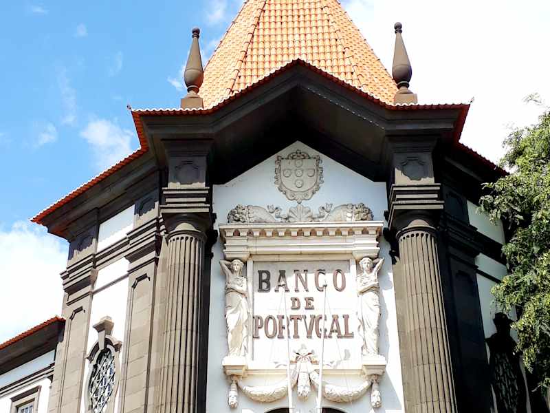 Das Bankgebäude der "Banco do Portugal" befindet sich an der Kreuzung Avenida Arriaga/Avenida Gonçalves Zarco. Das zweistöckige Bauwerk wurde in den Jahren 1937 bis 1940 nach den Plänen des Architekten Edmundo Tavares errichtet. Homepage: https://www.bportugal.pt/arquivo/details?id=16087