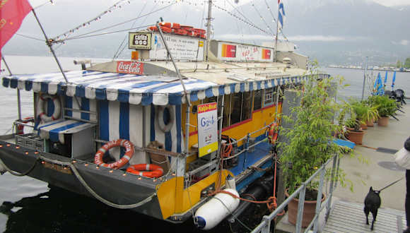 Die Bar liegt auf einem umgebauten Boot im Hafen von Locarno. Wir gehen seit vielen Jahren dorthin und das Boot hat viele andere Stammgäste. Früher fuhr man jeden Tag auf den See, heute nur noch am Wochenende gegen Aufpreis. Aber für einejn Aperitif vor dem Essen immer noch toll.