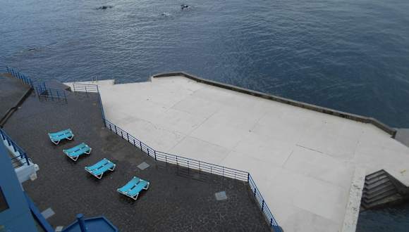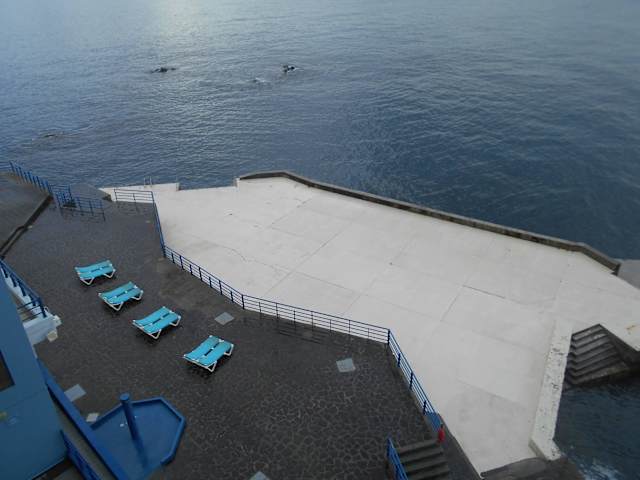 Das Freibad an der Küste unterhalb der alten Festung São Tiago hat einige betonierte Flächen, auf denen Sonnenliegen stehen, so dass man nicht über die groben Steine klettern muss, die ansonsten den Strand bilden.