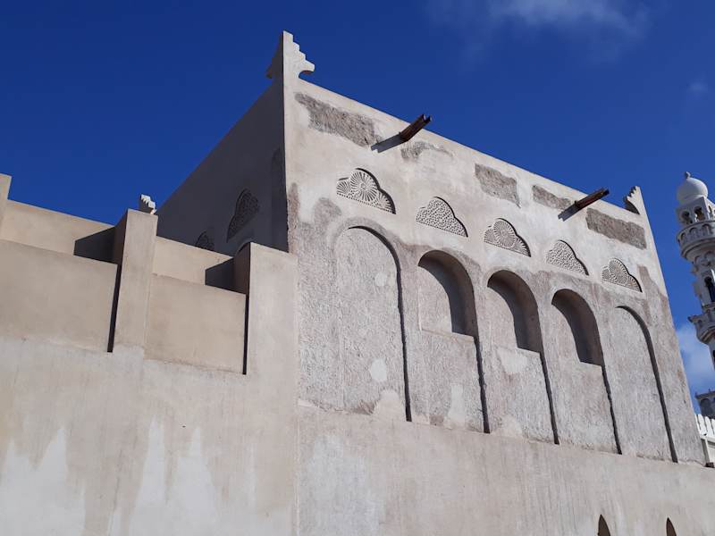 Der riesige Palast von Scheich Isa bin Ali befindet sich auf der Insel Muharraq entweder am Anfang oder am Ende des Perlenpfades, je nachdem von welcher Seite man startet. Leider hatten wir das Pech, dass der Eingang zum Palast wegen eines Starkregens am Tag zuvor komplett unter Wasser stand und wir es innerhalb unseres Aufenthaltes in Bahrain nicht mehr hineingeschafft haben. Von außen, bei der Umrundung der Palastanlage, kann man jedoch erahnen, wie groß er tatsächlich ist. Der Palast ist ein Paradebeispiel für die arabisch-islamische Profanarchitektur aus dem 19. Jahrhundert. Die hohen, breiten Mauern schützen nicht nur vor Feinden, sondern auch vor der unerträglichen Sommerhitze. Die Windtürme tun ihr Übriges.