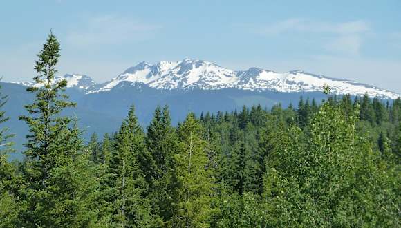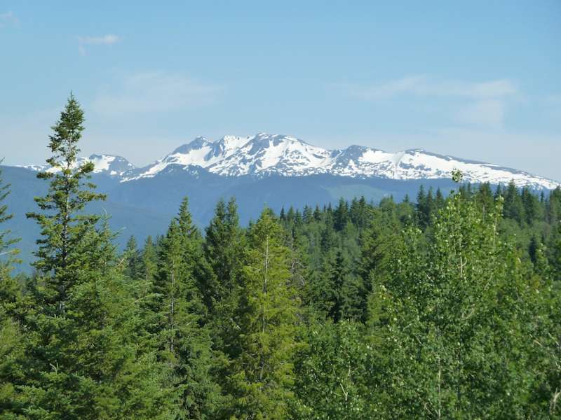 Einen Überblick über den Wells Gray Provincial Park soll man am Green Mountain 1042 m vom Aussichtsturm bekommen. Naja, es ist ja ganz nett aber kein unbedingtes muss, es ist eine sehr kurvenreiche Streck. Endlich oben angekommen hat man einen schönen Überblick mit viel Wald, auf den Vulkan Mt. Pyramid und ein entferntes Gebirgspanorama. Da hatten wir auf der Rundreise schon jede Menge.
