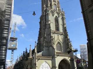 Der Turm wurde 1521 auf der Höhe des untern Achtecks (knapp 61 Meter) unterbrochen und erst von 1889 bis 1893 zur endgültigen Höhe von gut 100 Meter vollendet, was ihn zum höchsten Kirchturm der Schweiz macht. Dabei wurde nicht der Berner Sandstein, sondern der verwitterungsbeständigere Obernkirchener Sandstein aus Niedersachsen in Deutschland verwendet. Bis März 2007 wohnte im Münster ein Turmwächter; bis weit ins 20. Jahrhundert hinein hatte er die Aufgabe, Brände zu melden. 254 steinerne Stufen führen spiralförmig zur ersten Turmgalerie in etwa 50 Meter Höhe und weitere 90 Stufen zur zweiten Galerie auf 64 Meter, die dem Publikum ebenfalls zugänglich ist. Es eröffnet sich eine prachtvolle Aussicht über die Altstadt, die Aareschlaufe, die Berner Alpen mit Eiger, Mönch und Jungfrau im Südosten und die Juraketten im Nordwesten. Quelle: Wikipedia