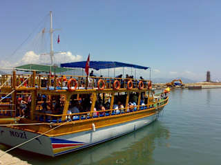 Paralell zu unserer Rafting-Tour (siehe Reisetipp) buchten wir bei Berfin-Tour (Türkler) bei Yasar auch noch die "Blaue Reise" nach Alanya (inkl. Mittagessen), von der ich hier berichten möchte: Wir wurden pünktlich um 8: 30 Uhr per Kleinbus vom Hoteleingang abgeholt und gemeinsam mit anderen Gästen (gemischte Nationalitäten) zur Anlegestelle kutschiert. Dort ging es dann sofort an Bord und kaum dass man sich einen Platz irgendwo auf dem Boot gesucht hatte, ging es auch schon los. Keine Hektik, aber auch keine längeren Wartezeiten. Leinen los und zuerst raus aus der Bucht und ab auf die "Seestraße". Mit uns gemeinsam fuhren geschätzte 10 Boote von ungefähr identischer Aufmachung in dieselbe Richtung, mit wahrscheinlich identischem Ziel. Nach ungefähr 1, 5 stündiger Fahrt bei mäßigen Seegang Richtung Alanya erfolgte der erste Badestop auf offener See. Es macht schon ne "Riesengaudi" einfach von der Bordwand ins erfrischende Meer zu hüpfen. Die Bord-Crew sorgte mit guter Musik und Animation (u. a. Tanzeinlagen) z. B. zu "Tarkan" für ausgelassene Stimmung. Die Sonne und die frische Brise, die einem ja ständig um die Nase weht, sorgten ebenfalls für gute Laune. Faire Getränkepreise an Bord (Cola, Fanta, Sprite und Soda je 1€- Bier (Efes in Flaschen) zu je 2€ - Stilles Wasser 0, 50€ - Alkoholische Getränke entsprechend teurer z. B. Wodka/Cola 2, 50€) UND EISKALT - Dicke Eisbrocken in der Gefriertruhe sorgten dafür, dass die Drinks ALLE sehr gut gekühlt waren. Ab und zu wurde man dann auch mal mit ein wenig Eiswasser aus einer Spritzflasche "erwischt" was auch für viel Gejohle sorgte. Mit Viel Spass und viel Sonne ging es dann in den Hafen von Alanya wo eine 2stündige, individuelle "Shoppingpause" angesetzt war, die meine Mädels wieder mal ausgiebig nutzten. (Schmunzel) Meinen "Jieper" nach einen "leckeren Döner" konnte hier zwar teilweise abgeholfen werden, aber der Döner bei uns zuhause ums Eck ist halt doch der Beste. Aber geschmeckt hat es trotzdem, genau richtig für den kleinen Hunger zwischendurch. Irgendwie bin ich dann auch in den Besitz einer Wasserpfeife geraten.....weiß gar nicht mehr wirklich wann und wo das war.....naja egal. Wir haben jedenfalls zäh verhandelt, immer und überall. Kaum wieder an Bord, ging es auch schon wieder weiter.....Mittagessen an Bord: Schon auf der Hinfahrt konnte man sich aussuchen was es denn sein sollte: Spagetti - Hähnchen - Forelle jeweils mit Salat und/oder Brot Aber auch außergewöhnliche Wünsche wie z. B. Spagetti mit Hähnchen waren kein Problem. Das Essen war heiß und schmeckte ausgezeichnet. Getränke wie immer exkl. zu obigen Preisen. Während man noch speiste, ging es schon mit Volldampf Richtung "Liebeshöhle" wo die wagemutigen von jedem Schiff von Bord gelassen wurden, damit diese sich an einem Seil zum Höhleneingang hochhangeln konnten, um dann durch die Liebeshöhle zu turnen, während wir außenrum fuhren, und sich dann aus einer Höhe von ca. 10m ins Meer zu stürzen und dann schlussendlich wieder an Bord genommen zu werden. Die einzelnen Springer wurden zwar mit Applause angefeuert, aber ein zurück gab es nicht. Wer drüben von Bord ging, MUSSTE hier runter. Nix für Papas Sohn......ich wollte mir nicht durch einen Bauchklatscher aus 10m Höhe den Urlaub verderben. Unmittelbar danach ging es Fische füttern und dann wieder weiter, bis zur nächsten Badepause kurz vor dem Kleopatrastrand. Zwischendurch immer wieder Animation an Bord - Bauchtanz - und kleine Leckereien - Wassermelone für alle. So ging es dahin bis zum nächsten Stop: Eine Höhle, wo man sich mit Schlamm einreiben sollte, welcher schon von Kleopatra genutzt wurde. Hier war es dann auch so, das sich einige Gäste wohl zuviel zugemutet hatten, was ihre Schwimmkondition und der Genuss von Wodka/Cola angeht. Jedenfalls musste die Bords-Crew eingreifen und einigen Schwimmer ein wenig mehr Auftrieb verschaffen. Irgendwann legte noch der "Eismann Mustafa" außen mit seinem kleinen Flitzer an unserem Boot an und versorgte intressierte Gäste mit Eis in 3 Sorten in Honigmelonenschalen. Ersin, der charmante Boots-Paparazzi (mit dem wir noch einen kleinen Sonderdeal eingingen, was "Fotos am Strand" anging) muss hier auch noch erwähnt werden. Super Bilder hat er an Bord gemacht die auch ihren Preis wert waren. Kurz nach 18: 30 Uhr waren wir dann recht erschöpft wieder im Hotel und hatten einen schönen Tag erlebt. Besten Dank auch nochmal an Yasar, der uns auf dieser Tour als Reiseleiter begleitete und für alle Fragen stets ein offenes Ohr hatte. (Die versprochene CD kommt per Post)