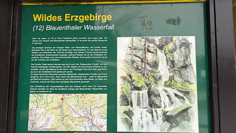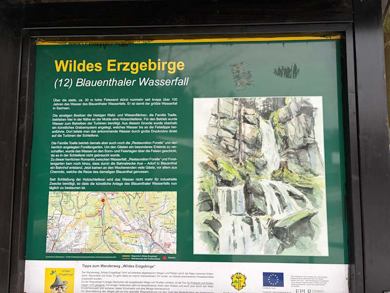 In der Nähe von Eibenstock in Blauenthal befindet sich einer der höchsten deutschen Wasserfälle außerhalb der Alpen über mächtigen Granitfelsen. Im Augenblick fließt leider nicht soviel Wasser. Durch das Hochwasser sind wohl Schäden entstanden. Trotzdem lohnt es sich vorbeizuschauen. Ein Parkplatz befindet sich in unmittelbarer Nähe. Unterhalb befinden sich auchein Rastplatz. Wer möchte kann von hier aus in das Köhlerdorf Sosa wandern.