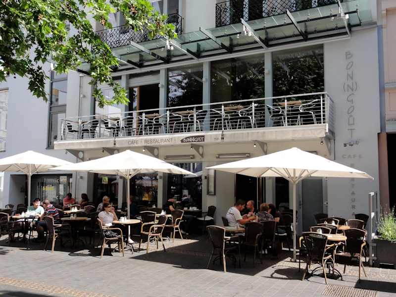 Das Café „Bon(n)goût“ liegt am Remigiusplatz in der Bonner Innenstadt, einen Katzensprung von der Universität entfernt. An zahlreichen Tischen und geschützt von großen Sonnenschirmen, lässt sich hier von morgens bis in die späte Nacht auf äußerst angenehme Weise das Leben beobachten. Unter der Woche sitzt man am Vormittag vis-á-vis des Blumenmarktes, während das Frühstück serviert wird. Die Speise- und Getränkekarte ist vielfältig, allein die Frühstücksangebote füllen 2 Seiten und hier dürfte wohl jeder etwas finden, was seinem Geschmack entspricht. Croissants, Rührei, französische Konfitüre und sogar norwegischer Fjord-Lachs stehen unter anderem in den verschiedenen Kategorien bereit. Die Nähe zur Uni beschert dem „Bon(n)goût“ ein aufgeschlossen-interessiertes Publikum bis in die Nacht. Ab dem Mittag hält die Küche zahllose Salate, Pasta- und Bistrogerichte vor – Tages- und Saisonkarten ergänzen das Spektrum. Der Service ist unkompliziert und kompetent, so dass man sich als Gast wirklich wohlfühlen kann. Preislich liegt das „Bon(n)goût“ im Rahmen seiner Mitbewerber und scheint mir einen Reisetipp wert zu sein.