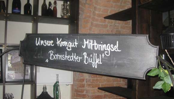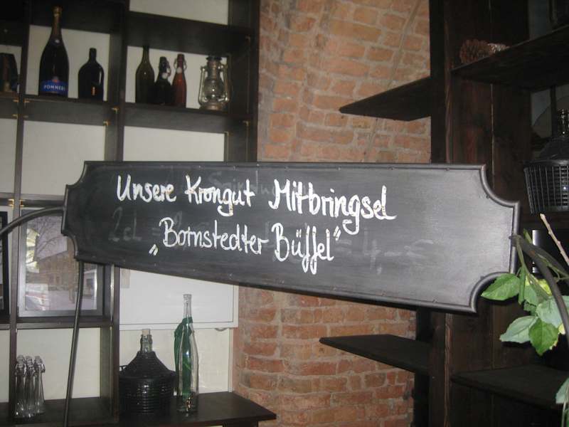 Das Krongut Bornstedt in Potsdam ist ein sehr beliebtes Ausflugziel in der Region Berlin – Brandenburg. Im Jahr 1867 übernahmen das Kronprinzenpaar Friedrich Wilhelm (1831–1888) und seine englische Gemahlin Victoria (1840–1901) das Hofgut Bornstedt und bewirtschaften das Anwesen und machten daraus einen Mustergutshof. Nach der Wende im Jahr 1999 wurde das Krongut Bornstedt aufwendig saniert und rekonstruiert. Im Jahr 1999 wurde das Krongut auch zum Unesco-Weltkulturerbe ernannt. Queen Elisabeth mit ihrem Gemahl Prinz Philipp waren im November 2004 hier zu einem Empfang eingeladen. Vor dem Besuch des Brauhauses machten wir mit unserem kleinen Enkelsohn einen Spaziergang durch die Anwesen des Gutshofes. In der Anlage befanden sich u.a. auch ein Tiergehege mit Schafen und Ziegen und ein kleiner Spielplatz. Interessant fand unser Enkel vor allem die drei Traktoren im Innenhof des Anwesens. Anschließend machten wir Mittagspause in der Hof Brauerei. Die Spezialitäten des Hauses waren bereits auf einer Kreidetafel vor dem Eingang der Brauerei angegeben. Wir waren überrascht von den urigen Gasträumen und den Brau - Einrichtungen des Restaurants. Da nur eine koreanische Reisegruppe zum Mittagsessen in der Gaststätte war, gab es genügend freie Plätze im Lokal. Die nette Bedienung brachte uns sofort die Speise- und Getränkekarte. Das Angebot auf der Speisekarte war nach meiner Ansicht für ein Touristen-Restaurant nicht gerade vielfältig. Wir haben uns für Schweinekrustenbraten mit Bayerisch Kraut und Kartoffelknödel 12,00 Euro und Schweineschnitzel „Lutter & Wegner“ mit lauwarmen Kartoffel-Gurkensalat und Preiselbeeren 14,50 Euro, entschieden. Zum Essen tranken wir ein Paulaner Hefeweizen (0,5 l) 3,90 Euro und das berühmte einheimische Bornstedter „Büffel“ Hell (0,5 l) 3,40 Euro. Das "Bornstedter Büffel" Bier wird bereits seit 1689 hier gebraut. Das Essen und die Getränke wurden uns in kurzer Zeit gebracht. Das Essen war sehr gut und auch die Portionen waren in Ordnung. Die Gaststube mit einigen Hirschköpfen an der Wand erinnerte uns an eine bayerische Jägerstube. Interessant fanden wir auch den altertümlich eingerichteten Nebenraum mit seinen vielen Bildern an der Wand. Uns gefiel das Brauhaus und wir können das Restaurant trotz einiger kleinerer Mängel weiterempfehlen. Nachdem Mittagessen kauften wir uns noch einen Kuchen in der gegenüberliegenden königlichen Hofbäckerei.