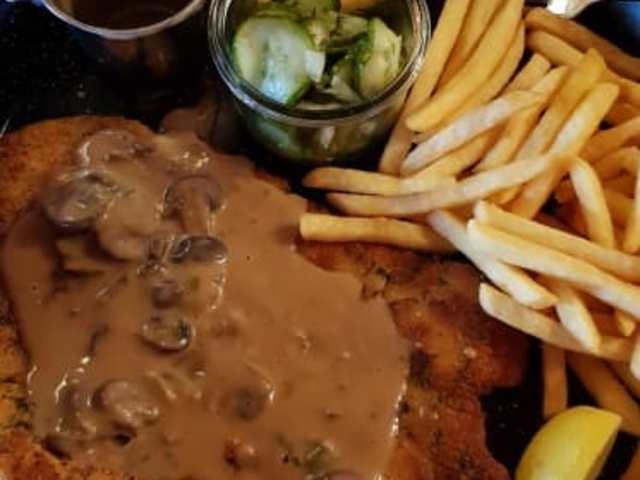 Wir hatten in diesem Restaurant im Rahmen einer Städte-Tour zum Glück vorher einen Tisch reserviert. Tolle Location, hoher Raum mit Galerie, wo wir saßen. An den Wänden Fotos von Politikern, Speisekarte „parlamentarisch“ aufgemacht. Ich habe ein Parlament-Schnitzel (= mit Jägersoße) bestellt: Ein Riesenschnitzel in Kräuterpanade, die Soße separat in einem Mini-Eimerchen, mit Pommes und Salat. Mayo, Ketchup und Barbecue-Soße standen auf dem Tisch, man konnte sich gratis bedienen. Service war super, das Essen in Windeseile auf dem Tisch. Wenn wir nochmal in Braunschweig sein sollten, werden wir jedenfalls dort einkehren!