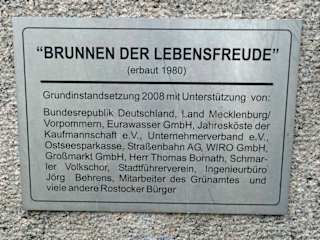 Dieser Brunnen wurde am 27.Juni 1980 eingeweiht, die Künstler D. Dietrich und Jo. Jastram haben etwas geschaffen, was wahrscheinlich nicht allen Rostockern gefällt. Da wir wissen, daß die Badenden in den Seebädern der ehem. DDR nicht gerade zimperlich mit dem Nacktbaden waren, möchten wir die Figuren, wie sie so dargestellt sind akzeptieren. Im Volksmund wird der Brunnen des öfteren als "Pornobrunnen" bezeichnet, na , na so etwas!!! Die richtige Bezeichnung soll die Einheit zwischen Mensch, Tier und Wasser symbolisieren.