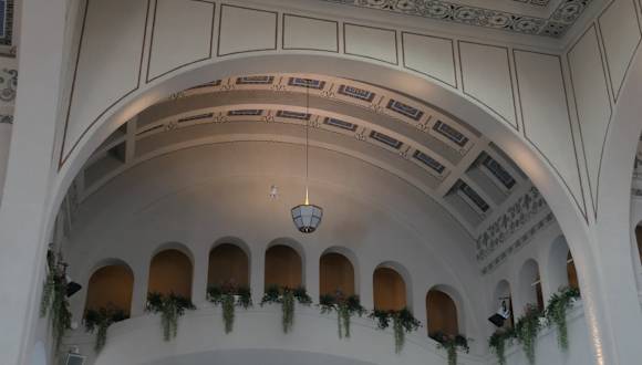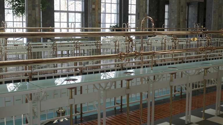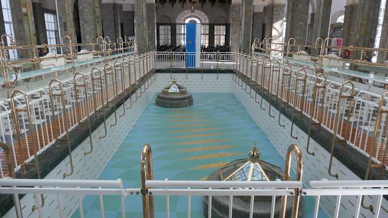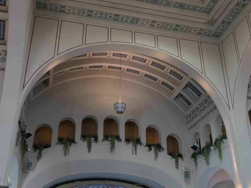Schönste Brunnenhalle ever. Prachtvoll, bestuhlt für Konzerte, es gibt Wasserausschank, schöne Fliesen und Blumenschmuck, riesige Halle, angenehm beheizt, hier kann man bleiben und das tolle Gebäude auf sich wirken lassen