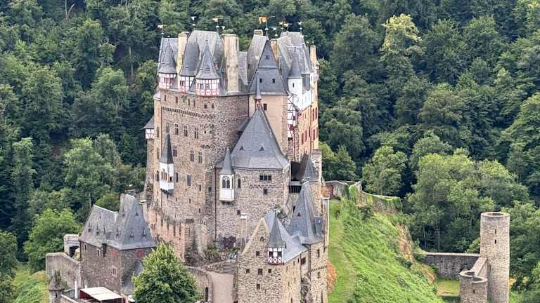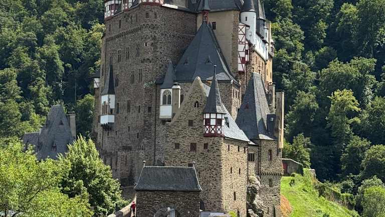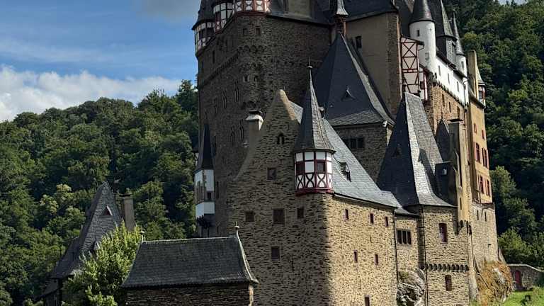 Die Burg Eltz ist eine der bekannteste Höhenburgen in Deutschland. Sie ist aus dem 12. Jh und liegt 129 m. ü. NhN im Tal der Elz in der Gemarkung Wierschem. Vom Parkplatz aus geht es mit einem kleinen Bus ca. 1,3 km bergab zur Burg. Man kann auch zu Fuß in ca. 10 Min. die Burg erreichen. Der Vorteil dabei ist, dass man immer wieder die Burg von oben betrachten kann. Mit dem Bus ist es schwierig zwischen den Bäumen bergab einen Blick zu erhaschen. Sehenswert ist auch der Besuch der Schatz- und Waffenkammer sowie die Teilnahme an einer Burgführung. Da die Burg auf einem Felsen in schmaler Bauweise errichtet wurde, können die Räume nur über viele Treppen und Stufen erreicht werden. Für Gehbehinderte ist dies leider nur schwerlich machbar. Vor dem Burginnenhof befindet sich auch ein Lokal. Früher wurde die Burg von drei Familienstämmen bewohnt. Da die Burg auf einem schmalen Felsen erbaut wurde, konnte man bei der Erweiterung nur noch in die Höhe bauen. Die Burg diente u.a. als Kulisse und Drehort für Filme wie den ARD-Märchenfilm „Rumpelstilzchen“, als Außenaufnahme im Film „Indiana Jones und der letzte Kreuzung“ (1989),“Der Kinderfilm „Der Prinz und der Prügelknabe“ und 2023 wurde auch teilweise der Märchenfilm „Das Märchen von der Zauberflöte“ dort gedreht.