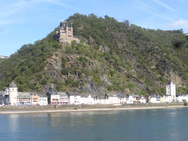 Am rechten Rheinufer, schräg oberhalb von St. Goarshausen, schwebt die Burg Katz, die Ende des 14. Jahrhunderts durch Graf Johann III. von Katzenelnbogen erbaut wurde. Sowohl vom Loreley-Plateau, als auch von St. Goarshausen (beides am rechten Rheinufer) hat man einen guten Blick zur Burg Katz. Aber auch vom Rhein und auch von St. Goar (am linken Rheinufer), kann man Burg Katz gut sehen. Da Burg Katz in Privatbesitz ist, kann man sie leider nicht besichtigen und so bleibt einem „nur“ der Blick aus der Ferne.