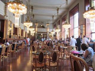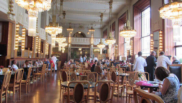 Das Cafe kann man beruhigt in einem Atemzug mit den großen Kaffeehäuser von Prag, wie Slavia, Louvre, Imperial, etc, nennen. Es gilt als eines der schönsten Jugendstilcafes in Prag und liegt im Erdgeschoss des Gemeindehauses Obecni Dum. Hier ist noch der Geist der zwanziger Jahre zu spüren. Man kann in einem wunderschönen Jugendstilambiente eine Tasse vorzüglichen Kaffees mit einem der berühmten Feingebäcksorten probieren. Zudem gibt es noch eine Speisekarte, sowie eine reiche Weinauswahl.