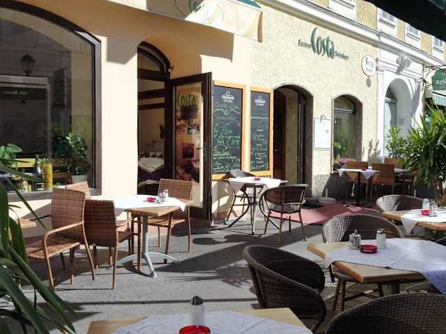 An der Bergstraße der Salzburger Neustadt liegt das Restaurant „Costa“, das auf seiner sonnigen Terrasse und in zwei Gasträumen eine in erster Linie italienisch inspirierte Küche mit Salaten, Pizzen und Pasta-Gerichten anbietet, daneben auf seiner Speisekarte aber auch Schnitzel in allerlei Variationen vorhält. Bei meinem Besuch bestellte ich eine „Pizza Prosciutto“ zum Preis von 9,20 Euro und bekam diese nach einer angemessenen Zeit serviert: Knuspriger Boden, dabei ein „fluffiger“ Teig, üppiger Belag und überdies im Steinofen gebacken – absolut nix zu meckern! Vielleicht gehört das Restaurant Costa nicht gerade zur Startbahn für kulinarische Höhenflüge, ist mir aber mit seiner Einrichtung im mediterranen Bistro-Stil, fairer Preisgestaltung und nicht zuletzt einem herzlich-zugewandten Service in guter Erinnerung geblieben.