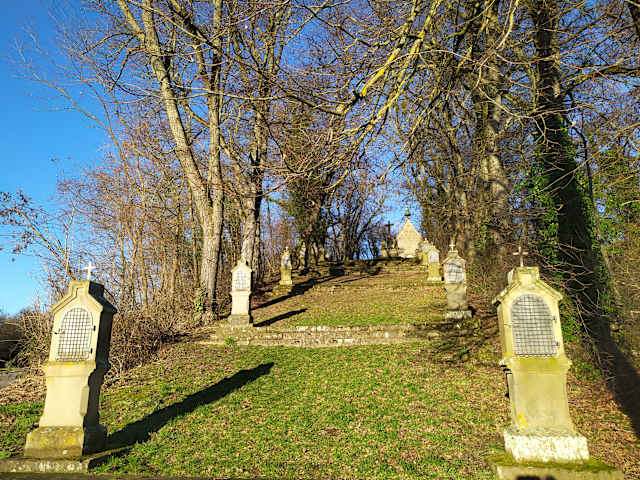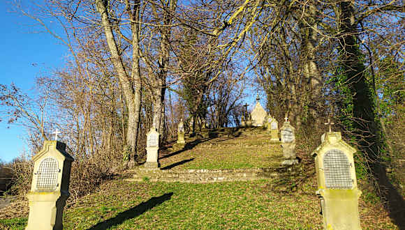 Mitte des 18. Jahrhunderts wurde oberhalb von Gundelsheim auf dem Calvarienberg eine Kreuzigungsgruppe aufgestellt. Um 1900 kamen 14 Stationen bis zur Kreuzigungsgruppe hinzu - die Bilder wurden später von einem regionalen Malermeister ergänzt. Die Gestaltung soll an den Hügel Golgatha erinnern. Hier herrscht eine besondere Atmosphäre und es gibt einiges zu fotografieren. Gutes Schuhwerk ist empfehlenswert wenn es geregnet hat da es auf der Grünfläche bergauf/ab rutschig sein kann. Leider waren die Bildtafeln bei unserem Besuch mit Spinnweben überzogen und auf der Innenseite der Metalltüren überwintern offenbar sehr gerne Käfer.