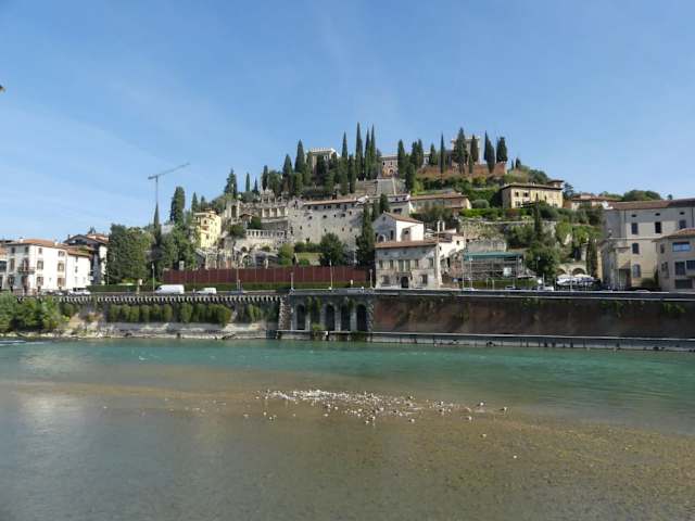 Die 1398 von der Visconti-Familie erbaute Burg war Vorzeigeobjekt der Familie, nachdem Sie 1387 die Regierung von den bisherigen Herren Veronas, den Scaligieri übernommen hatte. 1450 wurde die Burg in die bereits bestehende Stadtmauer integriert. Zur Burg führt auch eine Standseilbahn hinauf. Von Oben hat man einen sehr schönen Blick auf die Etsch, die römische Bogenbrücke Ponte Pietra und natürlich die Altstadt. Vom Fußweg am Ufer der Etsch entlang sieht man die auf dem Hügel thronende Burg. Piazzale Castel San Pietro 37129 Verona