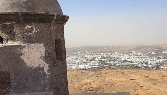 Über der kleinen Stadt Teguise tront auf einem Vulkan die Burg Santa Barbara. Eine kleine Strasse windet sich hinauf, man kann sie bequem mit dem Auto erreichen. Über eine Zugbrücke gelangt man in den kleinen Innenhof. Für EUR 3,00 kann man die Innenräume der Burg besichtigen, in der sich eine Ausstellung zur Spanischen Emigration befindet. Bilder, Bücher und Modellschiffe sind zu sehen. Witzig ist eine nachgebaute Szene mit Figuren aus Knetmasse. Da haben sich einige viel Mühe gegeben. Es gibt im Inneren eine Brunnen, der viele Münzen enthält. Aus dem Reiseführer entnahmen wir, dass die hineingeworfenen Münzen keinerlei Bedeutung haben. Ein Besucher hat mal damit angefangen und seither werden es immer mehr. Auf dem Dach der Burg hat man einen weiten Ausblick über das umliegende Land. Falls man nur nach oben will, ist dies kostenlos.