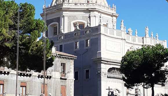 Diese Kirche war in früheren Jahren oft geschlossen, wegen Renovierung, aber jetzt ist sie wieder zu besichtigen. Die Kirche ist ein Barock Gebäude und sehr wichtig für Catania. Seitlich von der Kathedrale liegt sie. Es ist eine Abtei b.z.w. ein Nonnenkloster. Wenn sie das Geheinmis dieser Kirche erkunden wollen, dann gehen sie hinein und lösen ein Ticket für 3.-€,dann können sie die kleine Kirche sehen, aber das ist noch nicht alles. Es gibt einen Aufgang über 2 Wenedeltreppen zur herrlichen Kuppel. Die zweite Treppe ist sehr eng, man kann nur hinauf oder hinab allein gehen, "Gegenverkehr " ist nicht möglich, Aber man kann ja rufen ob schon jemand hinunter will. Dort oben hat man die schönste Aussicht über Catania mit einem 360° Gradblick, wenn das Wetter mitmacht sehen sie auch den Ätna. Hilfreich ist dann eine Kamera mit Tele.