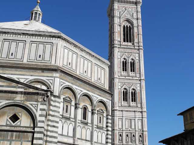 Der Platz an der Kirche Annunciata sollte eigentlich der Ausgangspunkt für einen Tag Florenz sein, eigentlich sind auch 2 Tage sehr kurz. Deshalb so interessant, weil die Kirche von 7°° Uhr bis 19°° Uhr geöffnet hat, da kann man früh mit der Besichtigung anfangen, aber auch andere wichtige Gebäude sind dort zu sehen. Auch ein schöner Brunnen, sowie ein Reiterstandbild. Von diesem gehen sie über die Via dei Servi auf den Dom zu, links kommen sie an dem privaten Museum von Leonardo da Vinci vorbei, aber je näher sie zum Dom kommen um so mehr wirkt die Kuppel. Diese 3 Highlights umrunden sie, auch ein Kurzbesuch im Dom ist noch drin, dann aber gehen sie über die Via del Calzaioli nach Süden, in der Hälfte halten sie sich links um zur Piazza della Republicca zu kommen, dann gehen sie auf der Via Roma weiter nach Süden, das nächste was interessant ist, ist der Orsanmichele. Dann nur noch wenige Schritte und sie sind beim nächsten Highlight der Piazza del Signoria mit dem Palazzo Vecchio und der Loggia di Lanzi. In den Innenhof des Palazzo sollten sie auch gehen, sehr interessant. Wenn jetzt der kleine Hunger kommt, gehen sie überall hin, nur nicht in die Caffeteria Letitia neben der Loggia. Dort verlangt man bei Selbsbedienung für einen großen Cappucino € 5.- Ein reiner Wucher. Über die daneben liegenden Restaurants kann ich nichts sagen, aber die haben das unsägliche COPERTO abgeschafft, steht wenigstens in dem Preisaushang. Es geht dann weiter zwischen den Gebäuden der Uffizien zum Arno. Dort hat man mit Blick nach rechts einen sehr interessanten aber allseits bekannten Blick auf den Ponte Vecchio. Natürlich muß man darüber und staunt über so viel Gold, die wahren Attraktionen sind aber woanders. Dann weiter zum Palazzo Pitti und weiter zur Via Romana zur Porta Roma. Dort ist die Haltestelle des Bus Nr. 12, er fährt zur Piazzale Michelangelo, mit dem schönsten Blick über den Arno und Florenz.