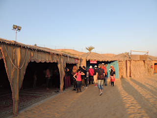 DADABHAI Travel - Massenabfertigung Pünktlich um 15.00 werden wir im Hotel abgeholt. Bei unserer Buchung im September war Hotelabholung auch in Ajman und Sharjah angeführt und vereinbart. Etwa 3 Wochen vor Abreise wurden wir auf per Mail informiert, dass der neue Treffpunkt ein Hotel in Dubai sei, zu dem man selbständig anreisen sollte. Auf meine Beschwerde hin wurde dann noch die Abholung in Ajman (45 Min. Fahrt) akzeptiert. Eine andere Familie fuhr auf eigene Kosten nach Dubai! Da unser Fahrer offenbar auch für die Koordination der Abholung einer anderen Familie zuständig ist, deren Fahrer einen Auffahrunfall hatte, telefoniert er die gesamte ¾ Stunde, die man bis zur Einfahrt in die Wüste braucht, und fährt nebenbei einhändig in übertriebener Geschwindigkeit. Nachdem er uns bei einer Quadstation vergebens zu einer Quadfahrt (2 Personen 400 AED/20 min) überreden versuchte geht es weiter in die Wüste, wo er mit rasender Geschwindigkeit über die Dünen braust sodaß wir froh sind nicht viel zu Mittag gegessen zu haben. Wir fahren etwa 15 Minuten bis zu einem Aussichtsplatz von wo man eine gute Aussicht über die Dünen hat und wo jedem dem leicht übel wird schon der kalte Schweiß ausgebrochen ist (also dieser Ausflug ist nichts für schwache Mägen oder wenn man vorher gegessen hat). Nach 10 Minuten durchqueren wir wieder die Wüste, bis wir auf der anderen Seite wieder auf die Straße kommen wo wir dann gegen 17.15 im sogenannten Wüstencamp ankommen. Dieses stellt sich als gammeliges Hüttendorf voller Tische und Polster auf dem Boden heraus, in dem Touristen wie eine Viehherde zusammengetrieben und abgefertigt wird. Die Schlange für den 30 Sekunden Kamelritt ist elendslang, das Dünenboarding stellt sich als etwa 10 m Düne und 3 Snowboarde heraus, um die sich ebenso zig Menschen bemühen . Allein die vor dem Camp abgestellten etwa 40 Fahrzeuge zeugen von der Massenabfertigung die einen dann im inneren des Camps erwarten. Anstellen bei der Hennabemalung, die sich als Blume auf der Hand zeigt die schon am nächsten Tag abgewaschen ist, ein kleiner Becher mit Teebeutel und einem Topf heißes Wasser zur Selbstbedienung, um 18.30 der gleichzeitige Ansturm von etwa 200 Touristen zu 2 Ausgabestellen vom „sogenannten Buffet“ wobei es sich um die Menge von 1 Falafel, einem Minikebap (8 cm) und einem Teigfladen mit Pesto (4cm Durchmesser) auf einem Pappteller handelt. Jeder muss sich selbst extra anstellen, mitnehmen für die Kinder geht nicht, jeder bekommt dieselben 3 Dinge, egal ob Vegetarier (Kebap) oder hungrige Jugendliche. Man kann sich natürlich ein 2.x anstellen wenn man genug Geduld hat. Wir hatten sie nicht und haben um 18.15 auf die nachfolgende Touristenattraktion – den Bauchtanz – verzichtet und unseren Fahrer gebeten uns nach Sharjah zurück zu bringen. Er wollte noch bleiben und hat uns einem Fahrer weiter gereicht, der schon Dienstschluß hatte und uns netterweise zum Goldsouk nach Sharjah brachte, wo wir gegenüber im Restaurant Danial am Dach des Crystal Palace Center sehr gut Speisten. Das All you can eat Buffet dort lässt von Vorspeisen über Haupt- und Nachspeisen keine Wünsche offen und kostet 60 AED/Person. Frische Fruchtsäfte (Mango, Orange, Himber etc.) kosten im großen Glas 10 AED. Wie wir am nächsten Tag von einer Familie erfahren, die im gleichen Hotel wohnte, gab es danach wohl noch Reis, Teigfladen und Fleischspieße, aber alles schon eher kalt und nur unter Ellbogeneinsatz beim Gedränge am Buffet.