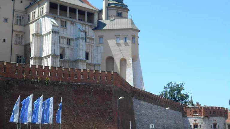 Im 14. Jahrhundert wurde das Königsschloss auf dem Wawel als eine um einen Innenhof angelegte Burganlage errichtet. Der größte Teil entstand unter König Kasimir dem Großen. Die Heilige Jadwiga Andegaweńska, eine Großnichte von Kasimir wurde 1384 mit nur 10 Jahren Königin von Polen und war die einzige Frau auf dem polnischen Thron. Unter ihrer Herrschaft wurden der noch heute sichtbare „Dänische Turm” und der „Hahnenfuß” an der Ostfassade des Schlosses, sowie die Burgmauern errichtet.