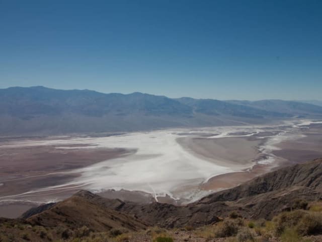 Bei der Anfahrt auf das Death Valley lohnt es sich, einen kleinen Umweg zum Dante's View in den Black Mountains in Kauf zu nehmen. Von dieser Erhebung aus überblickt man aus 1669m über Meresspiegel das Tal des Todes von Badwater Bassin bis in den zentralen Teil. Man hat außerdem einen Ausblick auf den 3366m hohen Gipfel des Telescope Peak. Am Ende der Straße befindet sich ein Parkplatz. Von dort aus kann man einige hundert Meter laufen, um eine noch bessere Aussicht zu bekommen. Hier oben ist es noch deutlich kühler als im Death Valley.