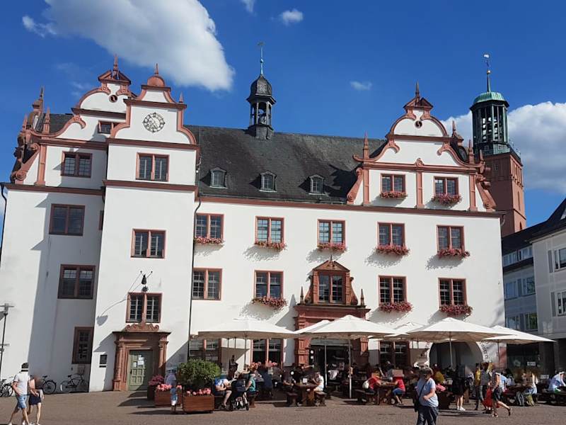 Der Ratskeller liegt zentral direkt am Marktplatz (Marktplatz 8). Geöffnet ist täglich von 11 bis 1 Uhr. Man bekommt deftige Gerichte in guter Qualität und meist unter 10 Euro. Der Keller ist sehr gemütlich eingerichtet. Der Service ist sehr aufmerksam. Besonders zu empfehlen sind die selbst gebrauten Biere. Nach einem Einkaufsbummel oder Museumsbesuch (das hessische Landemuseum liegt ganz in der Nähe) kann man sich hier gut erholen.