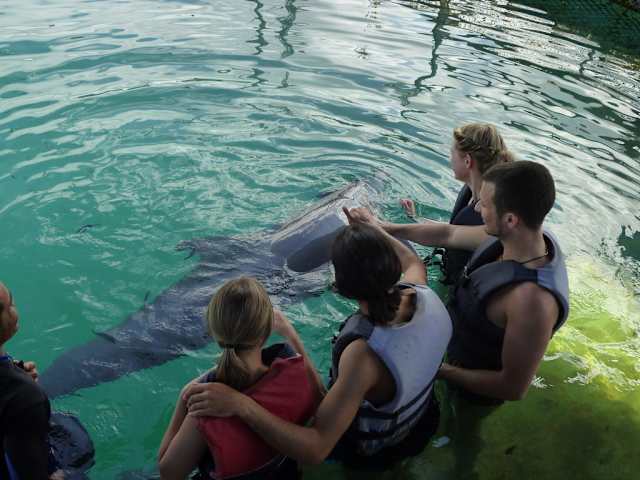 Fakten: Wir haben die "Dolphins Lodge" über unseren Reiseveranstalter gebucht für 55,- EUR p.P. In dem Prospekt welches in der Lodge ausliegt sind folgende Preise angegeben: Erwachsene: 69,- USD Kinder: 59,- USD Im Preis inbegriffen ist der Pick-up Service, Getränke vor und nach dem Schwimmen, Transport per Boot zu der Schwimmenden Plattform, 40 min Delfinschwimmen, sowie ein frisches Handtuch nach dem Schwimmen. Mein Erlebniss: Nach einer Einweisung durch den Trainer wurden wir mit einem kleinen Boot zu einer schwimmenden Plattform im Meer gefahren, in der die Delfine für die Therapie gehalten werden. Jeweils ein Trainer ist mit je 2 Paaren (also 4 Gästen) im Therapiebecken. Wir konnten dem Delfin ganz nahe sein, ein tolles Erlebnis. Nebenbei erklärte uns der Trainer noch einiges zur Anathomie des Delfins. Natürlich gehörten auch einige kleine Kunststücke zum Programm. Ein einmaliges Erlebnis, was sich jeder Tierfreund einmal gönnen sollte. Nach der ca. 40 min war es leider schon vorbei. Weitere Auskünfte vom Trainer: Jeder der 8 in der Anlage gehaltenen Delfine macht am Tag je nur 2 "Shows" (Therapie-Sitzungen) á 40 min. Am Abend gegen 18Uhr werden die Delfine ins offene Meer gelassen. Sie sind auf ein bestimmtes Signal abgerichtet mit dem sie am nächsten Morgen wieder zurück gerufen werden. Die Delfine sind ja auch nicht dumm und wissen, dass es dann was zu fressen gibt.