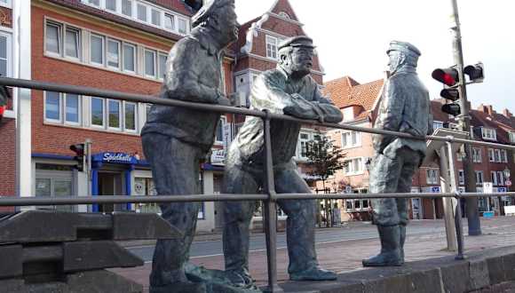 Am Ratsdelft im Herzen der Emder Altstadt befindet sich ein spannendes Denkmal – die „Delftspucker“. An das Geländer zum tieferliegenden Hafenbereich lehnen drei Herren, von denen zwei den Hafen beobachten, während der Dritte am Treiben in der Stadt interessiert ist. Die drei Bronzefiguren des Künstlers Hans-Christian Petersen stehen für die Tradition des letzten Jahrhunderts, sich hier im maritimen „Alt-Herren-Club“ zum Klönschnack zu treffen und dabei Kautabak zu konsumieren, den man anschließend in das Wasser des Delfts spuckte. Und tatsächlich machen dies die beiden hafenseitigen Figuren immer noch – etwa alle halbe Minute gibt es einen heftigen Strahl aus dem Mund der Müßiggänger und am nassen Boden kann man erkennen, von wo man dieses Schauspiel gefahrlos ohne Dusche verfolgen kann.