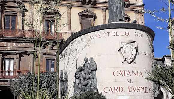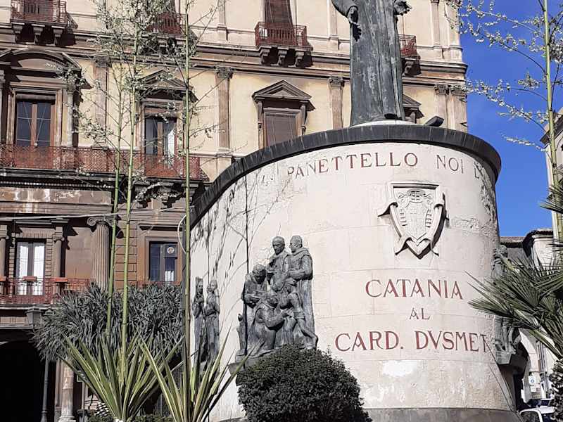Das Denkmal für den 1894 verstorbenen Kardinal und Erzbischof von Catania Giuseppe Benedetto Dusmet steht vor der imposanten Kirche auf der Piazza San Francesco d'Assisi. Ihm wird eine wundersame Heilung zugeschrieben, die 1988 zu seiner Seligsprechung auf dem Petersplatz in Rom führte.