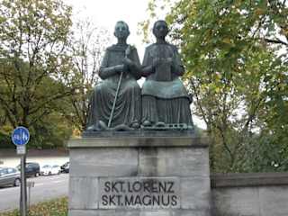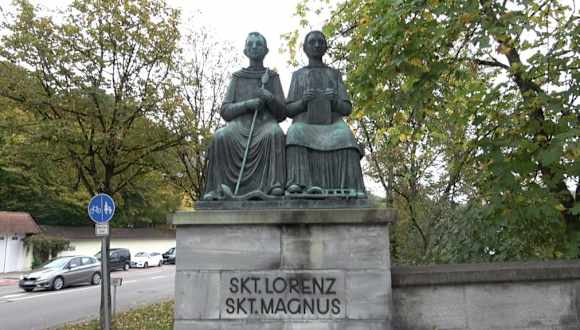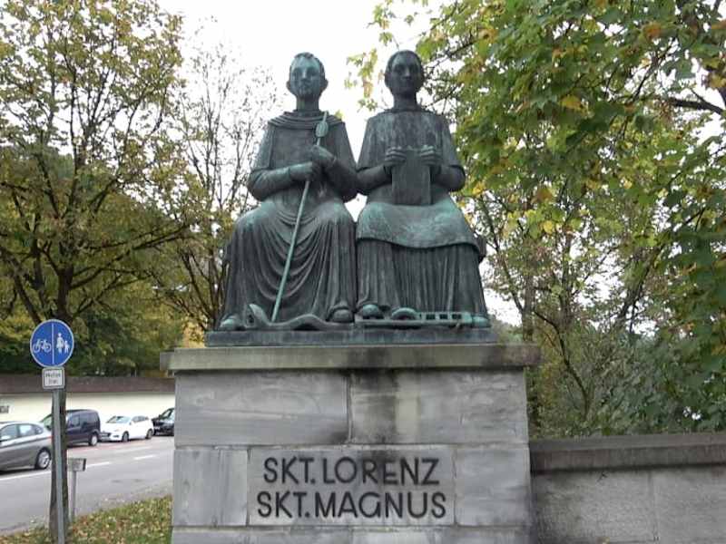 Die Heiligen Laurentius von Rom und Magnus von Füssen als Denkmal an der St.-Mang-Brücke in Kempten. Der heilige Magnus von Füssen lebte vermutlich als Einsiedler, im 8. Jahrhundert in Füssen. Das Denkmal steht auf der linke Seite der Brücke, Fahrtrichtung in die Stadt.