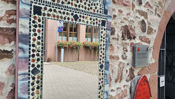02.08.24 Sprechender Spiegel / Lohr am Main TIPP: Schneewittchens Schloss im Hintergrund Am Schlossplatz an der Außenwand des Fachwerkgebäudes der Touristeninformation ist eine Nachbildung des berühmten „Sprechenden Spiegels“ angebracht. Das Original hängt nebenan im Spessartmuseum im Schloss und entstand in der Kurmainzischen Spiegelmanufaktur in Lohr im 18. Jh. Stellt man sich vor den Spiegel und macht ein Foto ist Schneewittchens Märchenschloss im Hintergrund zu sehen.