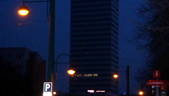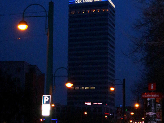 An der Magistrale der Karl-Marx-Allee von Frankfurt an der Oder erhebt sich der schon von Weitem sichtbare „Oderturm“. Mit seiner beträchtlichen Höhe von 90 Metern ist er von keinem Punkt der Kleist Stadt zu übersehen und somit das höchste Bürogebäude in Brandenburg. Es entstand in den Jahren 1968 bis 1976. Der Oderturm ist ein Wahrzeichen von Frankfurt (Oder). In dem Büro und Einkaufzentrum mit einer zeitgemäßen teilweise überdachten Einkaufspassage hat man die Möglichkeit, aus der Gaststätte im 24. Stock einen Panoramablick weit über die Stadt an der Oder und darüber hinaus kilometerweit nach Polen zu blicken. Bei unserem Besuch an einem Sonntag im März waren die Geschäfte leider geschlossen. Auch der Zugang vom Brunnenplatz (Parkplatz) zu den Fahrstühlen war nicht leicht zu finden. Man musste vom Brunnenplatz den Gesamtkomplex umrunden um den Fahrstuhl zum Panorama Restaurant zu finden. Der Oderturm beherbergt gastronomische Einrichtungen wie China Imbiss oder Eiscafè, Buchhandlungen, Büros, Arztpraxen und sonstige Dienstleister. Namhafte Firmen wie zum Beispiel Karstadt Schnäppchen, Rossmann, Nordsee, Leiser, WMF und Vodafone sorgen dafür, dass hier ein attraktiver Einkaufsort für das Publikum vorhanden ist. Auch die Spielbank Frankfurt (Oder) hat hier ihr Domizil. Eine Tiefgarage mit 190 Stellplätzen und 250 kostenpflichtige Parkplätze auf dem unmittelbar angrenzenden Brunnenplatz stehen zur Verfügung.