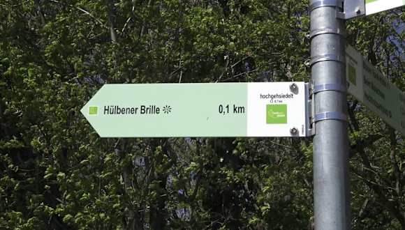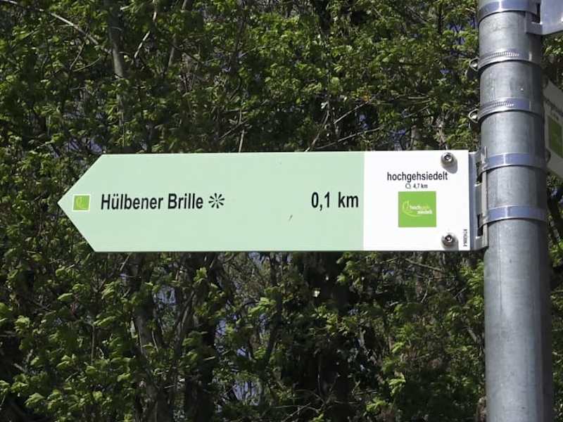 Vom Wanderpark Hochholz sind es 500 m bis zum Kunstobjekt „Die Brille Hülben“. Früher war hier eine Erddeponie, das Gelände wurde aufgefüllt und man hat seither einen tollen Blick auf den Albtrauf. Das Kunstobjekt vom Künstler Schwarz zeigt eine Brille. Ein Brillenglas schaut in die Landschaft, wenn man durchschaut sieht man die Burg Hohen Neuffen. Das andere ist gegen den Himmel verbogen. "Du siehst die Erde, die Sterne, die Pflanzen, die Tiere. Siehst Du den Menschen, ahnst Du den Schöpfer. Erkenne Gott in Christus!“ Diese Worte sind in die überdimensionierte Brille eingraviert.