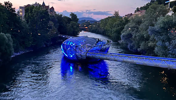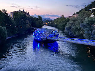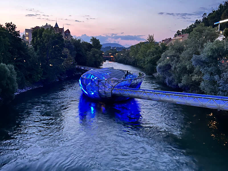 Die Murinsel ist eigentlich ein Veranstaltungszentrum auf der Murg. Sehr futuristisches Aussehen macht die Insel zu einem Fotomotiv erster Kategorie. Sie wurde für das JAhr 2003 entworfen und man wollte Sie später eigentlich entsorgen, aber mittlerweile bleibt sie weitere 10 Jahre. MAn kann dort KAffee trinken. Die Insel ist mit beiden Ufern der Mur verbunden.