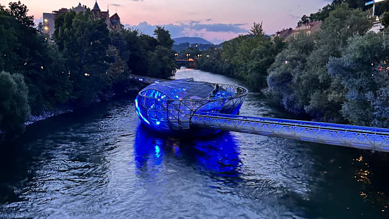 Das Cafe auf der Murinsel ist - wie die Murinsel selbst - undedingt einen Besuch wert. Man fühlt sich beinahe so, als würde man mitten im Fluss sitzen, außerdem ist die Murinsel auch architektonisch sehenswert und für die Kleinen gibt es einen Seilgarten mit Rutsche