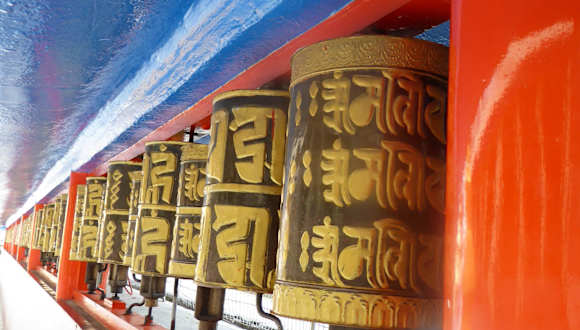 Nach unserem Besuch im Tibetology Museum machten wir noch einen Ausflug zu Fuß zur Do-Drul Chorten Stupa. Die goldene Kuppel vom Do-Drul Chorten Stupa ist fast von ganz Gangtok aus sichtbar. Der Do-Drul Chorten Stupa ist der größte Stupa von Sikkim. Der Do-Drul Chorten Stupa liegt auf eine Anhöhe und ist über einen kurzen steilen Aufwärtsweg in einigen Gehminuten vom Museum aus, zu erreichen. Der Stupa wurde von Trulshik Rinpoche (1923-2011) im Jahr 1945 gebaut. Der Legende nach, soll er diesen Stupa gebaut haben, um die bösen Geister von hier zu vertreiben. Trulshik Rinpoche war auch einer der Hauptlehrer des 14.Dalai Lamas. Im Inneren der Stupa befinden sich Reliquien bestehend aus einem Mandala Set des Dorje Phurba, einer Ausgabe der Kann-gyur Reliquien (heilige Schriften) und vielen anderen Objekten. Der Stupa war ursprünglich ein Grabdenkmal über der Asche eines prominenten Mönchs. Im Laufe der Zeit wurde der Stupa zu einem Symbol und Mahnmal der Buddhalehre. In Tibet heißen diese Reliquienschreine "Tschörten" oder "Chorten". Nach der Überlieferung hat Buddha selbst seinen Schüler Ananda angewiesen, Erinnerungsmerkmale für erleuchtete Wesen zu errichten. Als „Muster“ diente dabei eine umgedrehte Reisschale mit einem darin steckenden Wanderstab. Es gibt acht Kategorien von Stupas, jede dieser acht wird einem bedeutsamen Ereignis im Leben des historischen Buddhas Shakyamunis zugeordnet. Gangtok ist das Zentrum des tibetischen Buddhismus in der Region. Der Do-Drul Chorten Stupa ist von 108 Gebetsrädern umgeben, von denen alle Mantras auf Tibetisch eingeschrieben sind. Im Buddhismus werden heilige Sätze oder Silben als Mantras angewendet. Jeder Buddha wird über ein eigenes Mantra angerufen. Die Zahl 108 ist die heilige Zahl im tibetischen Buddhismus. So bekommt in Tibet eine Frau zur Hochzeit 108 Zöpfe geflochten. Es gilt als äußerst segensreich, eine Kora um die Stupa zu machen und dabei die 108 Gebetsmühlen zu drehen. Kora bezeichnet man im tibetischen Buddhismus die rituelle Umrundung eines heiligen Ortes, also eines Heiligtums oder eines heiligen Berges. Wenn man die Gebetsräder dreht, dann im Uhrzeigersinn. Unser indischer Reiseleiter hat uns sehr ausführlich von der tibetischen Buddhalehre in Sikkim erzählt.