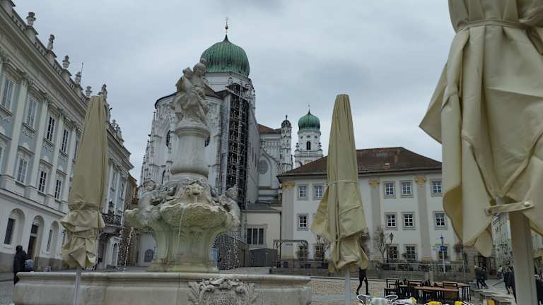 Der Domplatz ist der Vorplatz des Domes St. Stephan. Der Domplatz wurde bereits im Jahr 1150 geschaffen. Der Domplatz war im Mittelalter und der Neuzeit das Zentrum des Passauer Domkapitels, wurde aber erst 1824 zu einem öffentlichen Platz. Bis 1824 war der Platz für das Volk nicht zugänglich. In der Mitte des Platzes befindet sich das Denkmal des ersten bayerischen Königs Maximilian I. Zu Ehren von König Max I. Joseph wurde an seinem 25-jährigen Regierungsjubiläum am 16.Februar 1824 beschlossen, am Domplatz ein Denkmal für den König zu errichten. Die Bronzestatue befindet sich auf einem Granitsockel und wurde in den Zeitraum von 1824 bis 1828 errichtet. Das Max-Denkmal wurde am 12.Oktober 1828 eingeweiht. Wegen seiner ausgestreckten Hand wird das Max-Denkmal auch „der Regenprüfer“ genannt. Im Stadtbrand von 1662 wurden die meisten Gebäude am Domplatz sehr stark beschädigt. Viele der damaligen Herrenhäuser wurden im Laufe der Zeit im Stil des Hochbarocks erneuert und teilweise auch vergrößert. Diese Herrenhäuser am Domplatz sind heute teilweise kirchliche Verwaltungsgebäude oder Wohnungen. Es gibt laut eines Berichtes im Internet noch fünf bis sechs ehemalige Domherrenhöfen direkt am Domplatz. Passau ist seit 2021 Teil des UNESCO-Weltkulturerbes „Grenzen des Römischen Reiches – Donaulimes“. Auch die Domherrenhäuser sind Teil des UNESCO-Weltkulturerbes und zeigen die ehemalige Macht des Passauer Klerus.