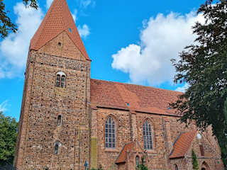 Die Dorfkirche von Kirchdorf auf der Ostseeinsel Poel in der Wismarer Bucht ist mit seinem hohen 47 m hohen Glockenturm eine ausgezeichnete Landmarke für die Seeleute bei der Einfahrt nach Wismar. Wir besuchten die Backsteinkirche, die auf einem Hügel im 13./14. Jahrhundert errichtet worden ist im April 2013. Von außen eher unscheinbar besitzt sie eine relativ reiche Ausstattung. Sehenswert sind zwei mittelalterliche Schnitzaltäre. Mehrere Indizien sprechen dafür, dass dieses Gotteshaus in mehreren Etappen in der Zeit von 1210 bis etwa 1350 gebaut wurde. Es gibt einige Hinweise dafür, dass der im romanischen Stil gebaute Turm der älteste Teil der Kirche ist. Als Wehrturm wurde er zunächst als Raum für Gottesdienste, Zufluchtsort, Speicher, Aussichts- und Glockenturm verwendet. Eine Erweiterung an den Turm wurde ungefähr um 1230/40 im romanischen Stil angebaut. Danach errichtete man etwa fünfzig Jahre später den Chorraum. In der Inselkirche befinden sich zwei geschnitzte Flügelaltäre aus dem 15. Jahrhundert. Der kleine Marienaltar befindet sich an der Nordwand. In einer Nische rechts neben dem Hauptaltar ist eine für Deutschland äußerst seltene Grabplatte mit Scheibenkreuz aus gotländischem Kalkstein zu sehen. Die Orgel der Kirche wurde 1704 aus Neukloster erworben. Ihr Prospekt stammt aus dem 17. Jahrhundert, das Werk wurde 1875 durch Friedrich Albert Mehmel im romantischen Stil erneuert und in den 1980er Jahren erneut verändert. 1936 baute Richard Schwarz das Modell eines Zeesenbootes, das seitdem an der Nordwand der Kirche steht. In der Kirche finden neben den Gottesdiensten im Sommer auch einige Konzerte statt.