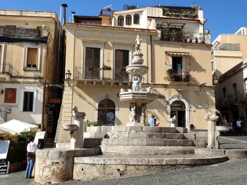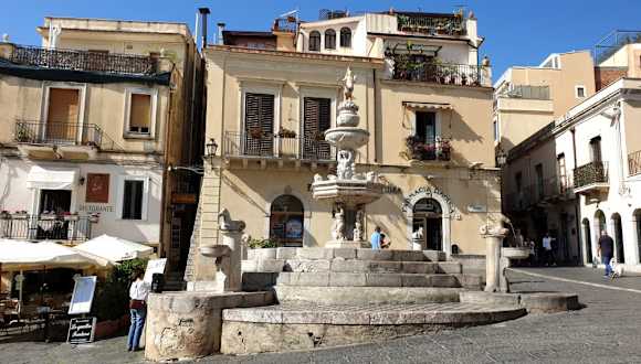 Im Zentrum von Taormina öffnet sich die belebte und geschäftige "Corso Umberto" zu einem kleinen Platz, wo sich der Dom und ein barocker Brunnen mit mythologischer Gestalt befindet. Der Dom ist eine Festungskathedrale und stammt aus dem 15. Jahrhundert, er besteht aus einem Haupt- und 2 Seitenschiffen, wo sich mehrere kleine Altäre befinden. Im Inneren sind der mehrtürige Flügelaltar und das Gemälde die "Byzantinische Madonna" zu bestaunen.