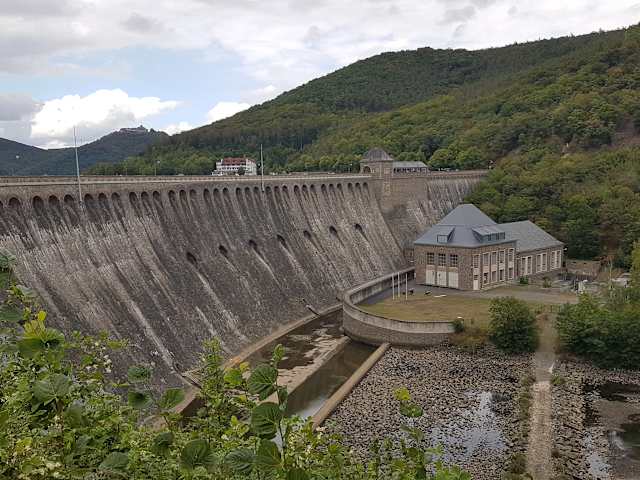 Wenn man am Edersee ist, so sollte man nach meiner Meinung auch zur Staumauer, der Edertalsperre, gehen und über Staumauer laufen. Der Spaziergang über die Staumauer war für mich ein ganz besonderes Erlebnis. Die Staumauer hat eine Länge von ca. 400 Meter, sie wurde zwischen 1908 und 1914 erbaut. Im Zweiten Weltkrieg wurde die Staumauer des Edersees bei einem Bombenangriff schwer beschädigt. Eine, wie es heißt, sechs bis acht Meter hohe Flutwelle raste durch das Edertal und weiter über das Fuldatal zum Wesertal Richtung Meer. Was der Flutwelle im Wege stand, wurde beschädigt, zerstört oder sogar weggespült. Dabei wurden große Landflächen überflutet und vorübergehend zu Seen verwandelt. Diese Flutwelle kostete vielen Menschen das Leben. Noch im Zweiten Weltkrieg wurde die Staumauer durch Zwangsarbeiter wieder aufgebaut.