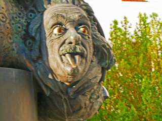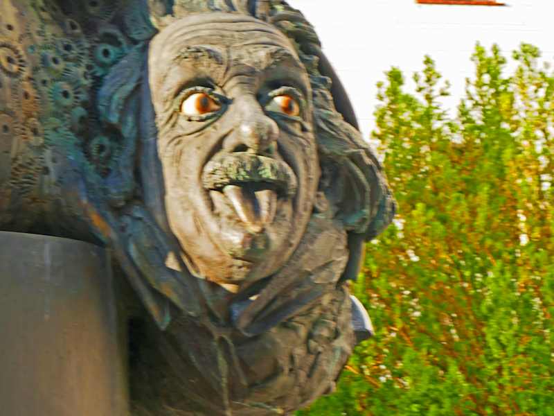 Die Überlegungen die man sich in Ulm wegen des Einsteinbrunnens gemacht hat, brachte mich zu der Überzeugung warum dieser Brunnen so schwer zu finden ist. Der Brunnen soll in Ulm am Zeughaus stehen, den Platz zeigt auch der Prospekt von Ulm, sonst nichts, aber das Zeughaus sind nur ein paar Mauern, welches ein solches Haus einmal war. Aber der Platz an welchem der Brunnen zu finden ist, ist das Neue Arbeitsgericht von Ulm und zwar direkt am Eingang. Geht man auf das Denkmal zu, sieht man zuerst einen Teil einer Rakete mit einer Schnecke obendrauf. Geht man dann etwas weiter herum, erblickt man auch einen kleinen Teil einer Weltkugel und weiter, erblickt man dann mehr versteckt das Haupt vom Einstein mit seiner Zunge. Dieses Gesicht ist fast jedem bekannt, aber der Künstler Jürgen Goertz hat sich bestimmt etwas dazu gedacht, denn alle Personen die aus dem Gericht kommen, sehen die Zunge von Herrn Einstein. Meine Überzeugung ist, damit sollen die heutigen ehrbaren Richter, die "Rache" des Herrrn Einstein zu spüren bekommen, die gilt aber nur den Hasspolitikern der teuflischen NAZIpartei, denen Einstein die Zunge heraus streckt. Und somit daß er diesen Oberverbrechern entkommen ist. Zuerst nach München, dann in die Schweiz und endgültig in die USA. Obenauf die Schnecke, somit auf Umwegen und langsam. Auch die Rakete hat doch eine Bewandnis, einige glauben Einstein hat die Atombombe erfunden, nein das hat er nicht, aber dem amerikanischen Präsidenten einen Tip gegeben, das Hitler so etwas planen könne. Kurzum, der Einsteinbrunnen ist eine Wucht !!!