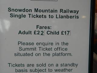 In LLanberis findet Ihr eine alte Zahnradeisenbahn, die auf den Berg Snowdon in 1085 Meter Höhe schnauft. Es werden 4 Züge eingesetzt, sie bestehen aus einem Wagen und der Lok. 2 werden von Dampfloks, zwei von Dieselloks geschoben, der Wagen immer vor der Lok bergauf. Wir sind mit der Dieselbahn gefahren, denn die Preise sind sehr hoch, Dampf 38 Pfund, Diesel 29 Pfund. Wenn Ihr die Diesel Variante wählt laßt euch Karten für die Sektion A geben, da sitzt Ihr direkt hinter dem Fahrer und nicht wie die Hühner auf der Stange. Die Fahrt zur Bergstation dauert 60 Minuten, oben angekommen kann man wandern oder nach 30 Minuten wieder zurück fahren, die einfache Fahrt kostet 22 Pfund ( eine Richtung ) Für Liebhaber alter Esenbahnen ein Muß,