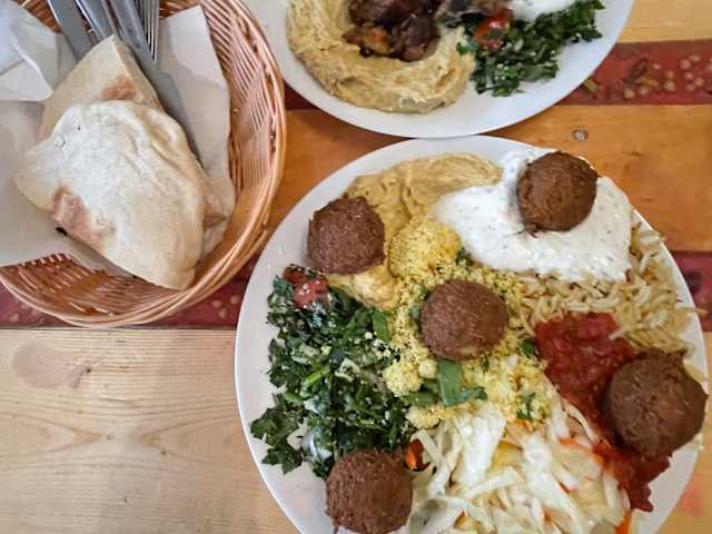 El Waleed ist ein kleines arabisches Bistro. Es liegt zentral im Barnstofer Weg 1. Von außen schaut es eher unscheinbar aus, dafür ist die Einrichtung drinnen mit den Palettenmöbeln deutlich ansprechender. Limon Bilnana hätten wir gern probiert, war aber leider schon aus. Wir hatten den Falafel Teller und den Schawarma Teller. Beide Gerichte haben uns überzeugt, Falafel waren schön knusprig und gut gewürzt, Tabouleh gut abgeschmeckt. Wir kommen gern wieder, wenn wir mal wieder in Rostock sind.
