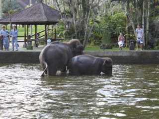 Über die Anlage mit Haltung von Elefanten wird man sicher zweigeteilt sein : entweder man liebt oder hasst es. Wenn aber man bedenkt, dass die Elefanten in Indonesien aus ihrem Lebensbereich vertrieben werden und so eine sehr schöne neue Heimat finden, dann ist nach meiner Meinung alles okay. Die Elefanten werden gut gehalten, gepflegt, bekommen sehr gutes Futter und sie werden beschäftigt. Die Anlage ist kommerziell aber sie wirkt nicht danach. Die "mahuts" sind ausgebildet, kommen fast alle von Java oder Sumatra und sind mit den Elefanten groß geworden. Die Elefanten haben niemals Stress gezeigt und ich habe in meinem Leben sehr viele Elefantenerlebnisse gehabt. Für Kinder halt ein Supererlebnis und so nah und lange an die Tiere zu sein, kommt man seltener in den Genuss. Geöffnet für Tagesbesucher von 10 - 17 uhr Hotelgäste haben die Möglichkeit schon ab Sonnenaufgang mit den Tieren zusammen zu sein bzw. zu beobachten. das Elefantenwaschen ist leider mehr Fotoshow. der Ritt dauert ca. 45 - 50 Minuten durch das weitläufige Gelände Gastronomie gut - auch preisslich sehr gut. 2 Tiershows ( ca.10 Minuten ) im Laufe des Tages eine Nachtshow ( gleiches Programm) nur für Hotelgäste Tipp : kauft vorher an der Straße Bananen, Obst und Erdnüsse, wir waren von über 150 Tages- und Hotelgästen, die einzigen die es getan hatten. Die Elefanten haben es aber 1000fach gedankt ( Füttern ist erlaubt und sogar erwünscht, wenn es sich um frische Sachen handelt ) Ich werde in den nächsten Tagen noch einige Fotos und Videos einstellen - bin noch am sortieren