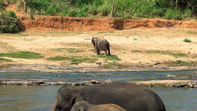Es war sehr heiß, manche Elefanten badeten am Fluss, sehr schön, sie zu beobachten, es war sehr voll mit Touristen aber man konnte fut sehen. Im Park selbst haben wir mehrere Elefanten gefüttert, es war ein Erlebnis.