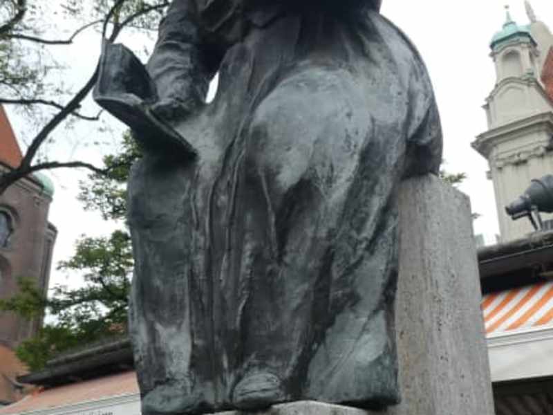 Am 23.09.1977 wurde zu Ehren der drei Münchner Originale Elise Aulinger, Roider Jackl und Ida Schumacher auf dem Viktualienmarkt drei Brunnendenkmale enthüllt. Der damalige Oberbürgermeister Georg Kronawitter hielt damals die Lobensreden für die drei bekannten Persönlichkeiten der Münchner Volkssängerzunft. Der Elise-Aulinger-Brunnen im Viktualienmarkt befindet sich in unmittelbarer Nähe von der Heiligen Geist Kirche. Elise Aulinger (11.12.1881 – 12.02.1965) war eine beliebte deutsche Volksschauspielerin. Die Bronzefigur von Elise Aulinger zeigt sie mit einem Buch in der Hand. Auf der Rückseite des Brunnens ist vermerkt: „Gestiftet von Eugen Kiesel“. Wie man im Internet nachlesen konnte, hat der damals 95jährige pensionierter Oberlokomotivführer als Spender des Denkmals, den Brunnen aufgedreht. In der Laudatio hieß es damals:“Sie sei unvergessen als Darstellerin g‘scheiter, resoluter, pfiffiger und dennoch herzensguater Bauersfrauen, die das Herz auf dem rechten Fleck haben, sowie als ergreifende Vorleserin der ‘Heiligen Nacht‘ von Ludwig Thoma“. Damit das Standbild von Elise Aulinger so naturgetreu wie möglich auf dem Viktualienmarkt stehen konnte, hat der Künstler Anton Rückel (1919 – 1990) die Tochter der Volksschauspielerin, die ihrer Mutter sehr ähnlich sah, zum Modell genommen. Anton Rückel hat für viele Kirchen und Klöster Kunstwerke geschaffen und in zahlreichen Gebäuden die gesamte künstlerische Innenausstattung übernommen. 1950 erhielt Anton Rückel von der Akademie für Schöne Künste den Bayerischen Staatspreis für Bildhauerei. Elise Aulinger wird auch als Rundfunkpionierin angesehen, da sie 1924 als erste "Die Heilige Nacht" von Ludwig Thoma im Radio vortrug. Im Bayrischen Hörfunk übernahm sie verschiedene Sprechrollen und spielte seit 1921 in zahlreichen Filmen mit, so z.B. in Filmen wie "Die Sterne lügen nicht" (1959) oder (Das sündige Dorf" (1954). Elise Aulinger hat auch auf der Bühne von Volkstheater und Kammerspielen mitgewirkt. Ihre künstlerische Karriere begann bereits 1903 im Münchner Volkstheater. Nach dem Krieg war jeden zweiten Samstagnachmittag 15 Minuten lang eine Sendung mit Elise Aulinger im Bayrischen Rundfunk. Elise Aulinger gilt als Erfinderin der berühmten "Ratschkathl". Bekannt ist die „Ratschkathl“ als Münchner Standlfrau (Marktfrau „Veronika Wurzl“), die singend und "ratschend" das Tagesgeschehen kommentierte. In der Rolle als „Ratschkathl“ beeindruckte dann etwas später Ida Schumacher als wohl treffendste Interpretin dieser damals typisch münchnerischen Frauenfigur. Elise Aulinger war mit dem Bühnenautor Max Sommer (alias Max Ferner) verheiratet. Sie war auch die Tante des beliebten Schriftsteller- Originals Sigi Sommer. Wie ich feststellte, war der Elise-Aulinger-Brunnen sehr begehrt, als Trinkbrunnen bei Einheimischen und Touristen bei der Sommerhitze im August.
